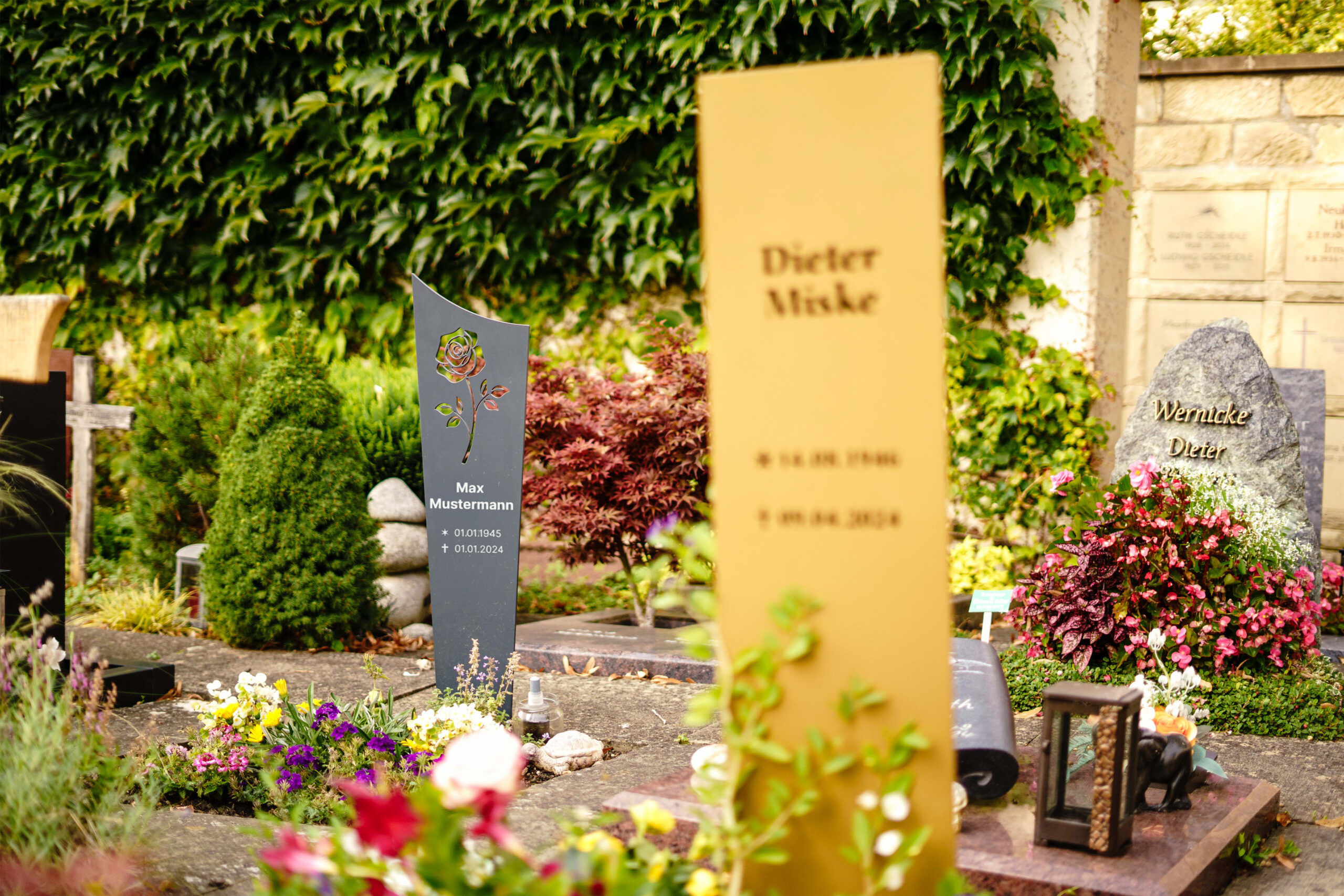 Durch individuelle Laserbeschriftung, einer zusätzlichen Grabumrandung oder Rasenkante wird Ihr Grabmal zu einer einzigartigen Erinnerung.